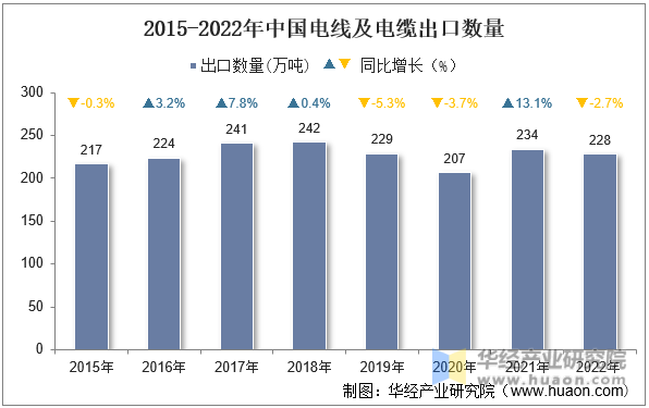 2022年中國(guó)電線及電纜出口數(shù)量為228萬(wàn)噸,相比2021年同期減少了6萬(wàn)噸,同比下降2.7%。